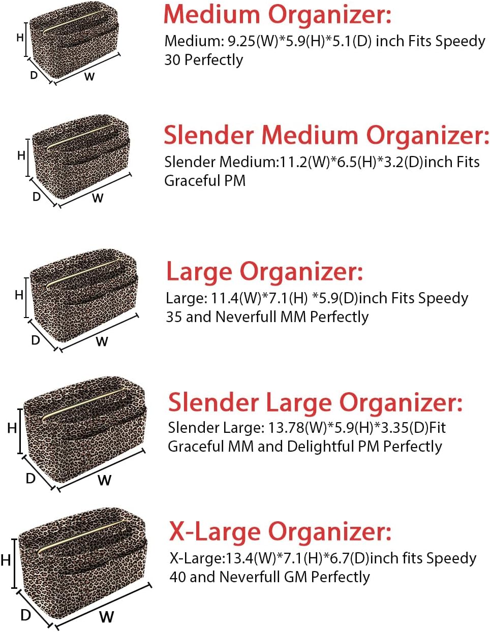 • SIZE OF BAG ORGANIZER: Medium: 9.25(L)*5.9(H)*5.1(W) inch Fits Speedy 30 Perfectly. Slender Medium: 11.2(L)*6.5(H)*3.2(W)inch Fits Graceful PM. Large: 11.4(L)*7.1(H) *5.9(W)inch Fits Speedy 35 and Neverfull MM Perfectly. Slender Large: 13.78(L)*5.9(H)*3.35(W)Fit Graceful MM and Delightful PM Perfectly. X-Large:13.4(L)*7.1(H)*6.7(W)inch fits Speedy 40 and Neverfull GM Perfectly. Portable and Compact Purse Perfectly For any Brand.L*H*W means (Length*Height*Width)