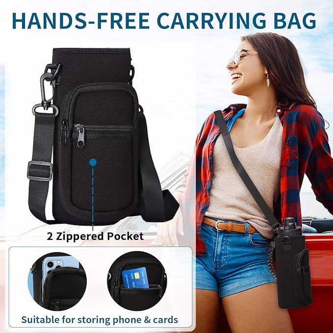 - HANDS-FREE BOTTLE CARRIER BAG & PROTECTIVE BOOT - 32oz stainless steel water bottle with hands-free shoulder carrier bag that features 2 zipper storage pockets to hold your phone, cards, and keys, and the shoulder carrier pouch also provides extra insulation. The protective silicone boot full-protects the reusable water bottle from additional damage and extends the life of thermo water flask bottle