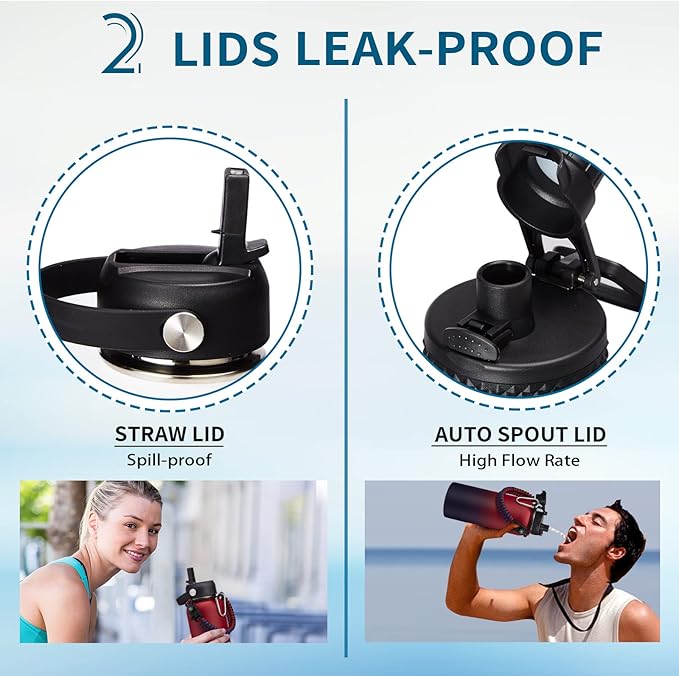 - LEAK-PROOF 2 LIDS - AUTO SPOUT LID & STRAW LID allow you enjoy spill-proof sipping and fast drinking to meet your different drinking needs. The pop-up spout lid is designed for one-hand open and close, with a large water outlet for fast drinking. The spill-proof straw lid makes you easy sip on the go, great to all your outdoor adventures, and also prevent the inhalation of ice cubes