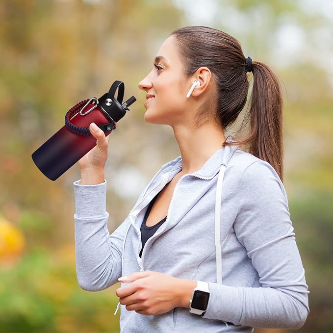 - SUPER DEAL COMBO - Buy one 32 oz insulated water bottles, get 9 accessories: 1 x straw lid, 1x Auto Chug lid, 1 x paracord handle, 2 x straws(BPA Free), 1 x carrier bag, 1 x shoulder strap, 1 x protective silicone boot, 1 x straw brush. The 32oz insulated water flask perfect to keep you stay hydrated throughout the day