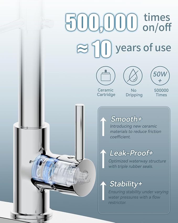 - 【EASY MAINTENANCE】Lead-free solid brass body and commercial SUS 304 stainless steel spring construction forged products. Chrome Polished surface treatment added 18/8 Chromium/Nickel content provides a superior anti-corrosion and anti-rust finish that prevents dirt such as fingerprints or water stains from adhering to the faucet surface, making the kitchen look cleaner. Daily cleaning with a cloth or water is enough, less time cleaning and more time having fun with your family.