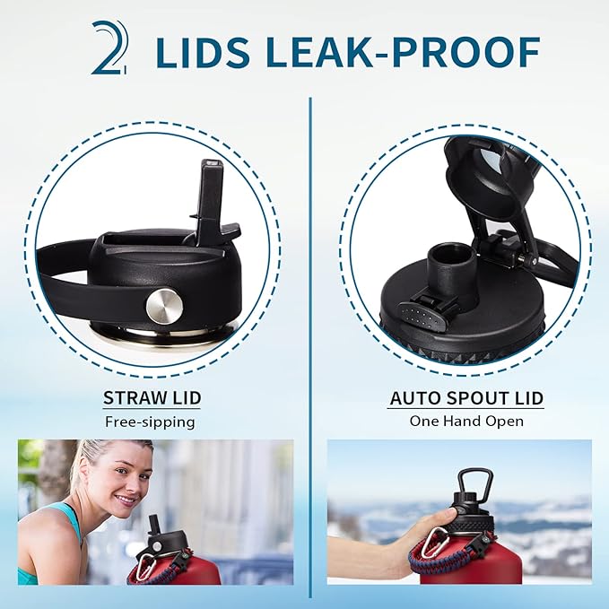 - LEAK-PROOF 2 LIDS - AUTO SPOUT LID & STRAW LID let you can enjoy spill-proof sipping and fast drinking to meet your different drinking needs. The pop-up spout lid is designed for one-hand open and close, with a large water outlet for fast drinking. The straw lid lets you sip on the go, with perfect spill-proof sipping to all your outdoor adventures, and it can also prevent the inhalation of ice cubes