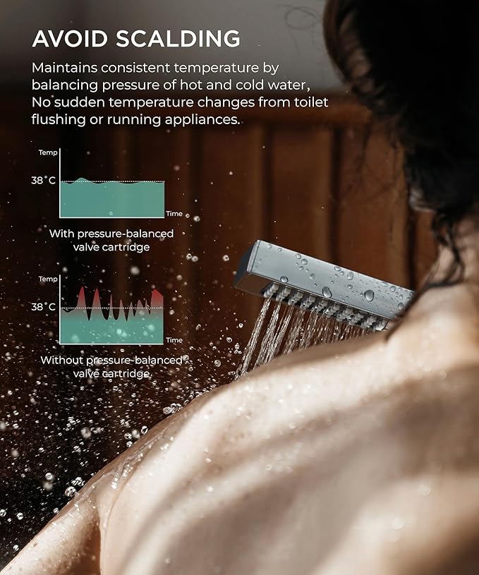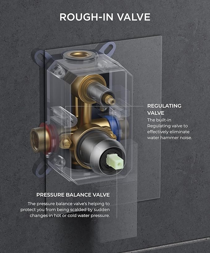 - Preventing Water Hammer: The pressure balance valve has two built-in check valves to effectively eliminate water hammer. Monitors the water pressure balance without sudden temperature changes from toilet flushing or running appliances