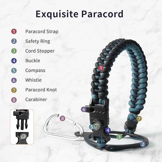 - Full-function Paracord: Brilliant paracord of matching colors bring out the bottle with a touch of youthful vibe. Compact compass and handy carabiner make the bottle the ideal survival kit for expeditions in the wild.