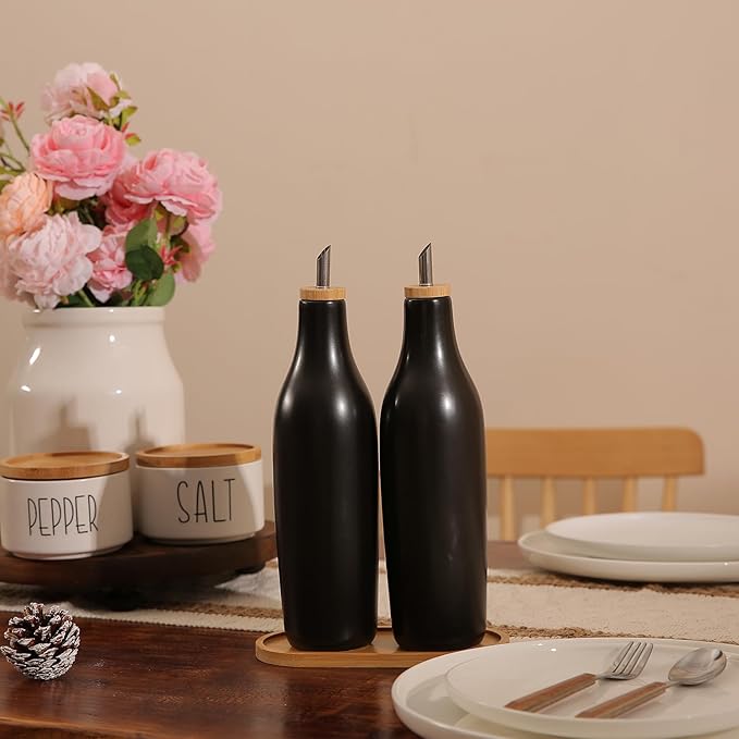 - KITCHEN BOTTLE DISPENSER - 16.9 fluid ounce (500 ml) Ceramic oil dispenser bottle or vinegar dispenser bottle with bamboo cap and stainless steel cruet spout, Works great as a kitchen dispenser for Olive Oil, Vinegar, syrups and more.
