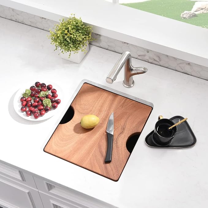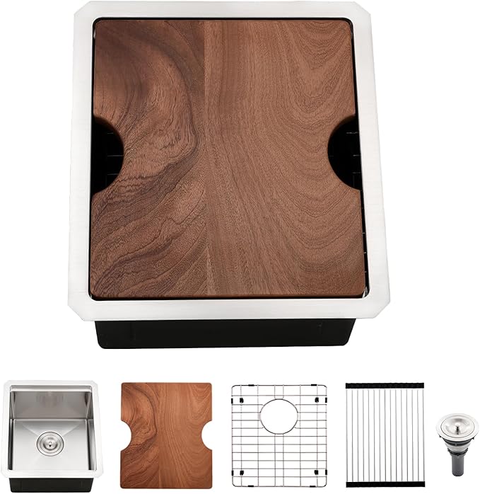 - Package Include: Stainless steel bar sink, cutting board, roll-up dish drying rack, bottom rinse grid, 3 piece basket strainer set, mounting hardware, cutout template