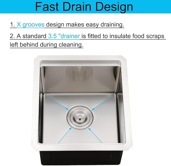 - Fast Drainage: X grooves design makes the undermount wet bar sink easy to drain and the standard 3.5" drain with removable basket makes water follow down fast and food debris hold into basket well