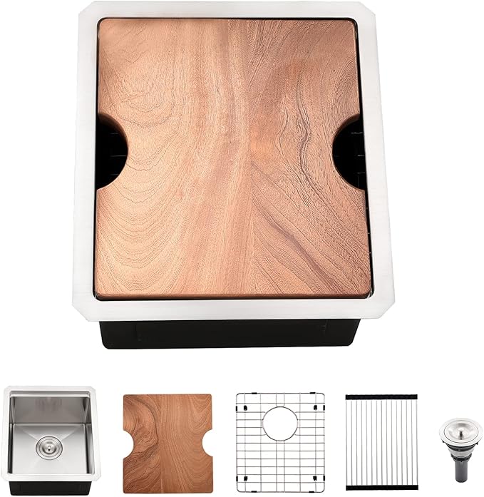- Package Include: Stainless steel bar sink, cutting board, roll-up dish drying rack, bottom rinse grid, 3 piece basket strainer set, mounting hardware, cutout template