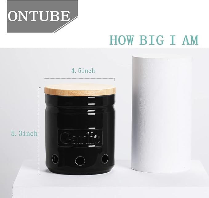 ONTUBE Large Garlic Keeper with Wooden Lid, Ceramic Garlic Holder Storage, Garlic Container for Kitchen, Garlic Saver to Keep Your Garlic Cloves Fresh Longer 4.5-Inch, Black