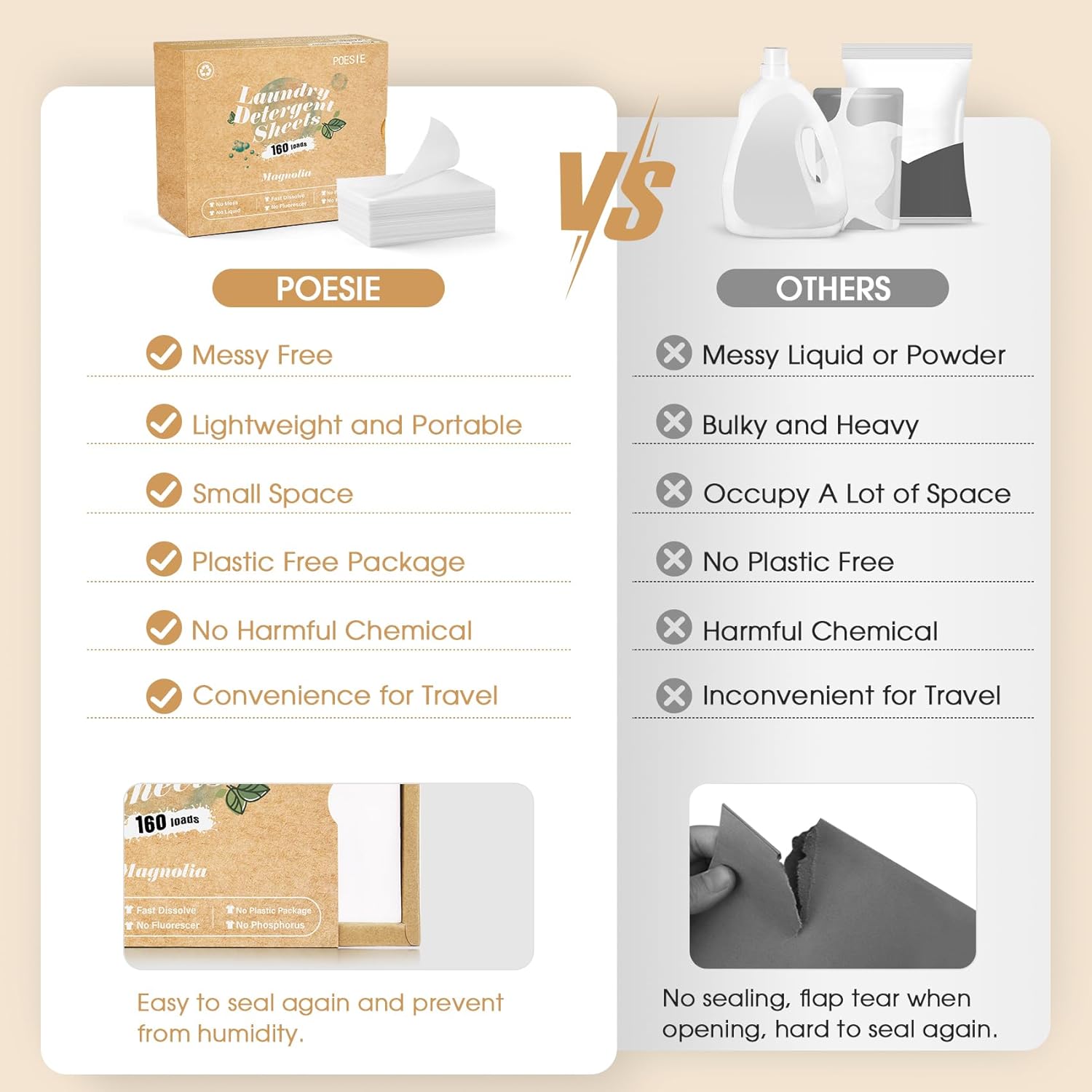 Poesie Laundry Detergent Sheets Magnolia Scent 160 Sheets 80 Large Loads Liquidless Effective Cleaning Zero Waste for All Washing Machine Traveling Dorm Life Save Space