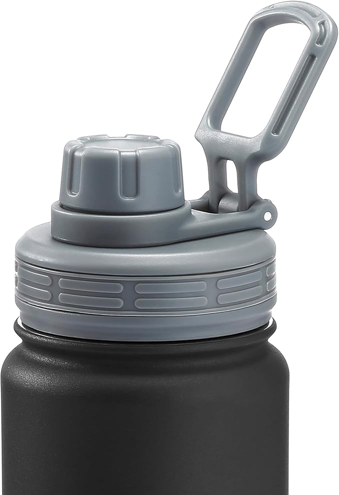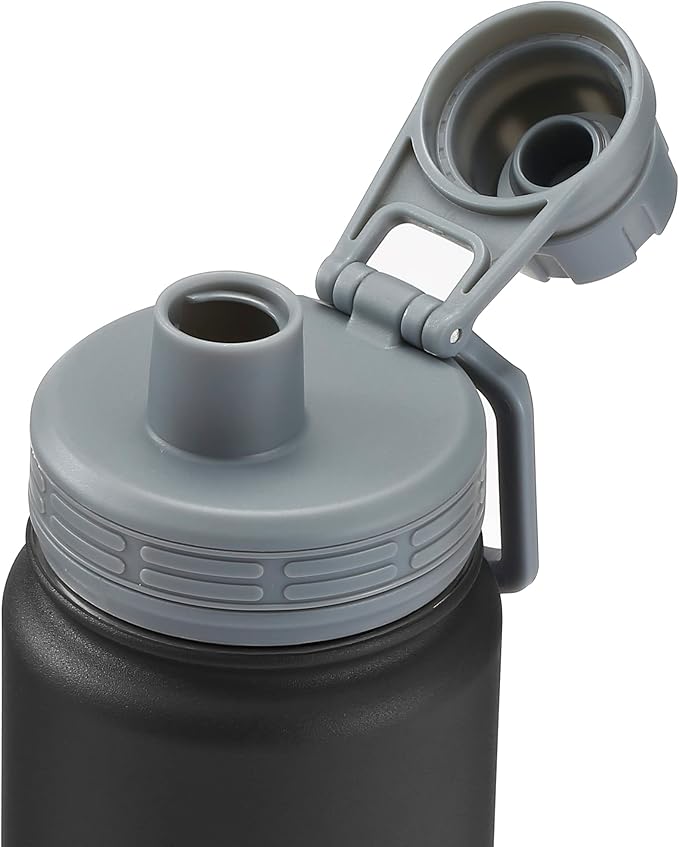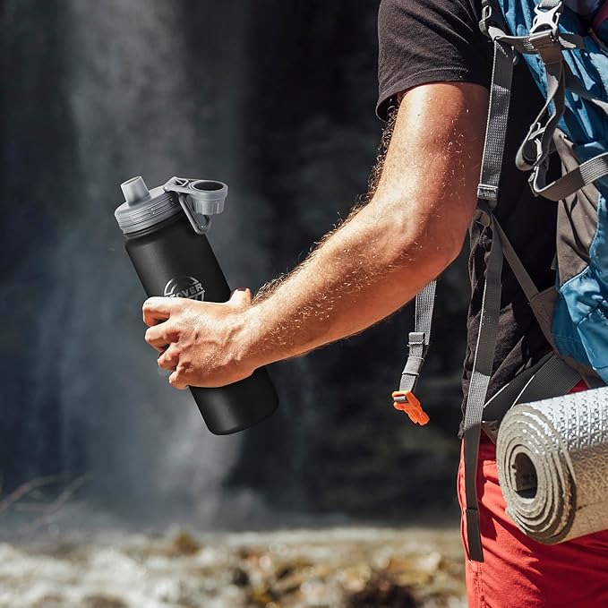 STOVER 25oz Insulated Water Bottle, Wide Mouth Double-Walled Stainless Steel- Vacuum Sealed, Leakproof, Durable, Slim Design Fits in Cup Holder- Flip Top Lid/Spout for Travel- Women/Men (Black)