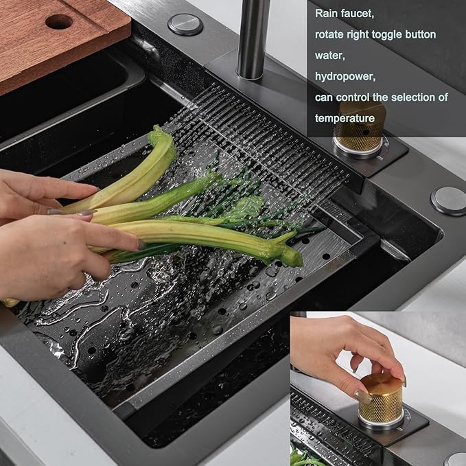 - 🏠【Versatile Design】This kitchen sink with waterfall can be installed as either an undermount or undermount sink depending on your countertop type, as it's perfect for both. The included cutting board provides a convenient surface for preparing food, making it a versatile addition to your kitchen workspace. Add style to bar countertops, kitchens, laundry rooms, outdoor and public areas with this kitchen sink!