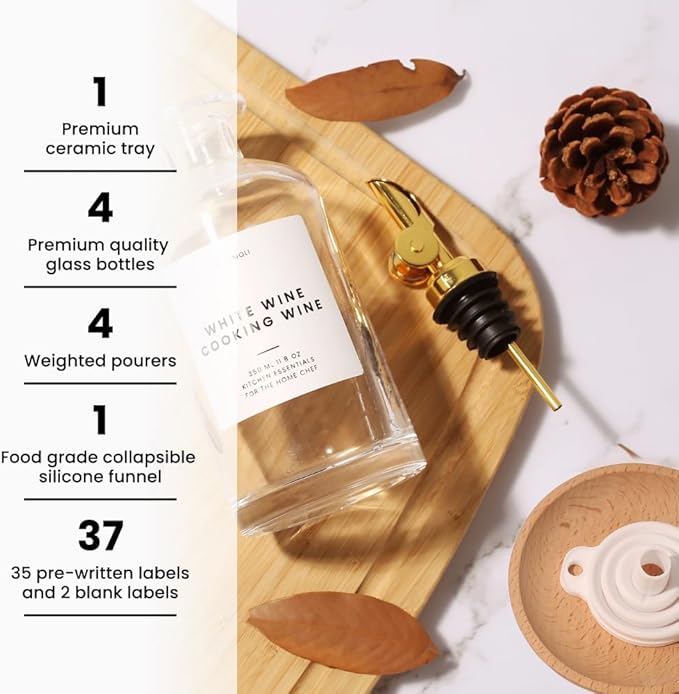 - Modern Kitchen Essential: Minimalism Inspired Cooking Oil Dispenser Bottle. This Set Includes Two High-quality 11.8 Oz (350 Ml) Glass Bottles, Two Gold Pourers, a funnel, and a 37 Label Set.