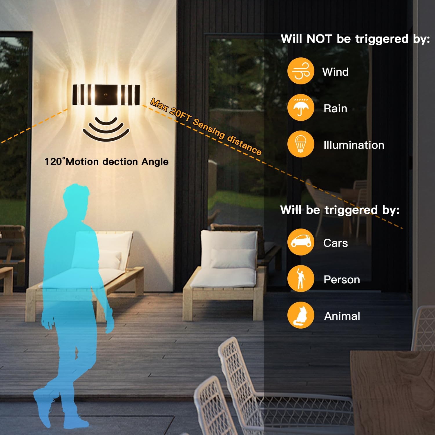 - ❗❗❗【Upgraded Motion Sensor】These motion sensor outdoor light combining the advanced PIR motion sensor & IC light sensor. Featuring with dusk to dawn function, these motion sensor lights will auto turn on at dusk and off at dawn. Furthermore, with upgraded motion sensor, the outdoor motion sensor light will auto light up your space with full brightness when motion detected at night.(Activation at dusk does not cause it to light up, it only causes it to activate the sensing function, this product will only light up at 100% brightness at night and when motion is detected and both conditions are met.)