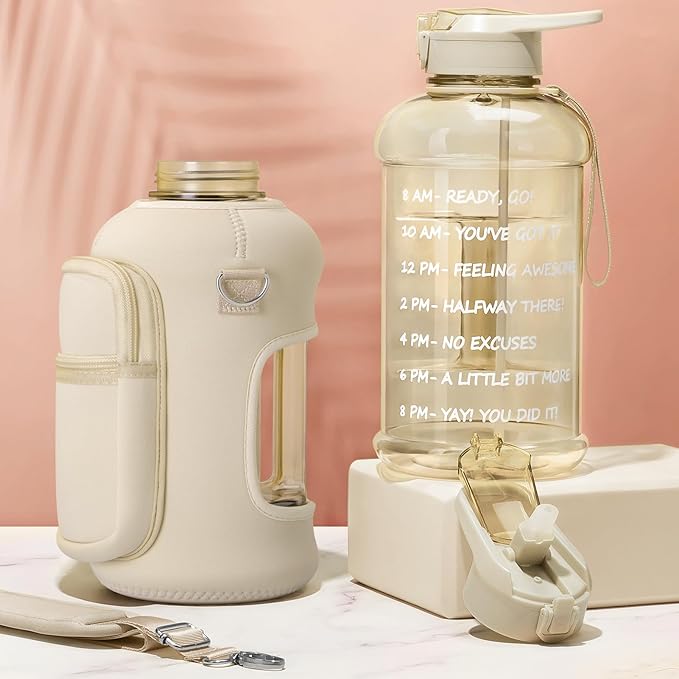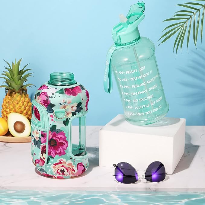 Fimibuke Half Gallon Water Bottle with Sleeve 64 OZ Water Bottle with Handle & Straw Leakproof Motivational Sports Gym Water Bottle with Time Marker BPA Free Water Jug with Reusable Neoprene Holder