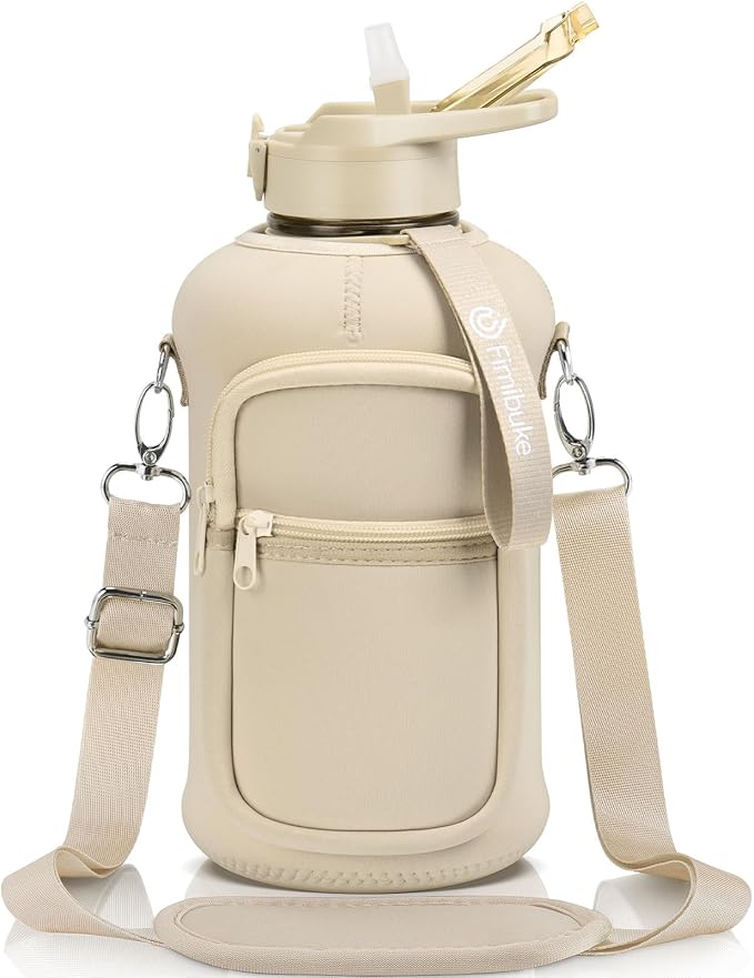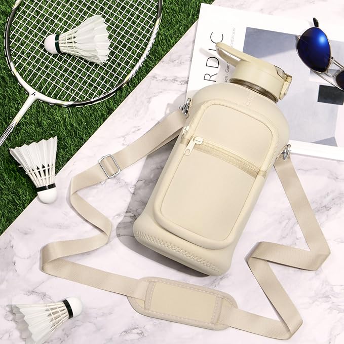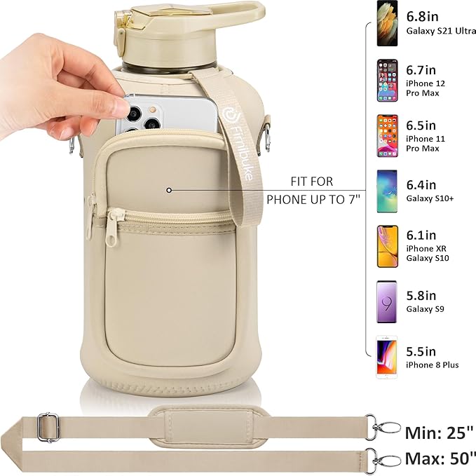 - INSULATED STORAGE SLEEVE: Our water bottle is designed with a high quality 5mm Neoprene sleeve, which not only can protect the water jug from slight bumps, but also keep water cold longer(water bottle is not insulated) and absorb messy sweat to avoid dripping on the table or seat. 2 zipper pocket is designed for storing your phone, card, airpods, etc. Comes with a adjustable & removable padded shoulder strap that can be adjusted from 25" to 50" to offer you more carrying options and hands free.