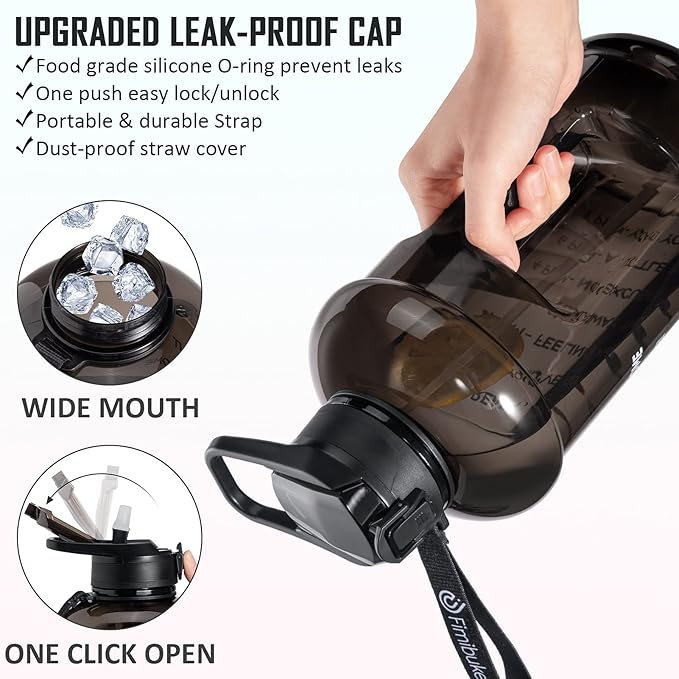 - STAY HYDRATED: Designed with time marker and inspirational quotes, Fimibuke half gallon water bottle is perfect for helping you stay motivated to drink enough water throughout the day. Featured with clear appearance and capacity scale helps you measure your daily intake of water easily and clearly. Featured with Wristband & hand held & shoulder strap that offering you with three way to carry, perfect for workout, traveling, running, hiking, cycling, camping, Yoga, or any other sports.