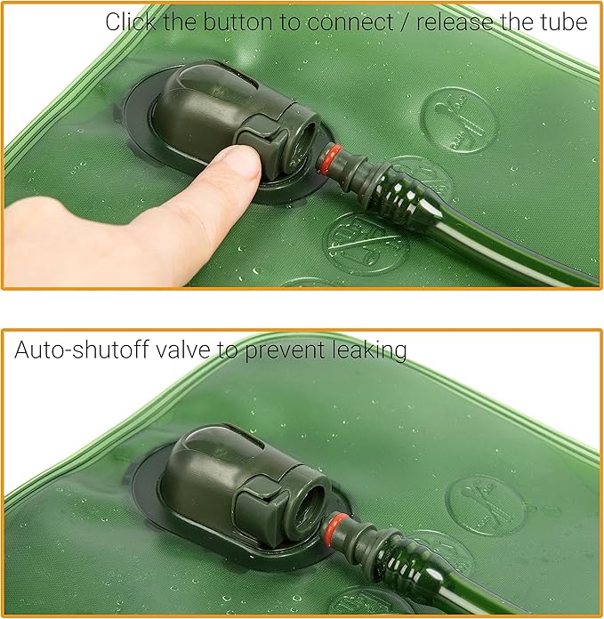 - Well-sealed faucet - Our high-flow bite valve allows you to drink water easily. Convenient control of water flow through the bite. Simply bite the mouthpiece to let water come out. Soft mouthpiece with an easy use on/off valve. It also has a dust cap to keep dust out. The auto-lock quick-release button allows the tube to be released off the bladder with a push onto the button. When the tube is released, the auto-lock button will lock the water and the water stays within the bladder.