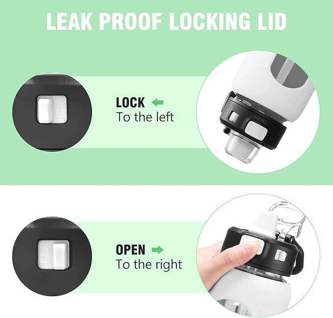 - LOCKING LID & CARRY LOOP - The locking lid ensures no spills while on the go and prevents accidental leakage even the water bottle tip over or be laid on its side. The lid flips open at the push of a button. The carry loop is made from a durable and flexible material that can withstand the weight of the filled bottle and the stress of carrying. Leak-proof lid, soft silicone straw mouth piece and travel friendly soft grip hand.