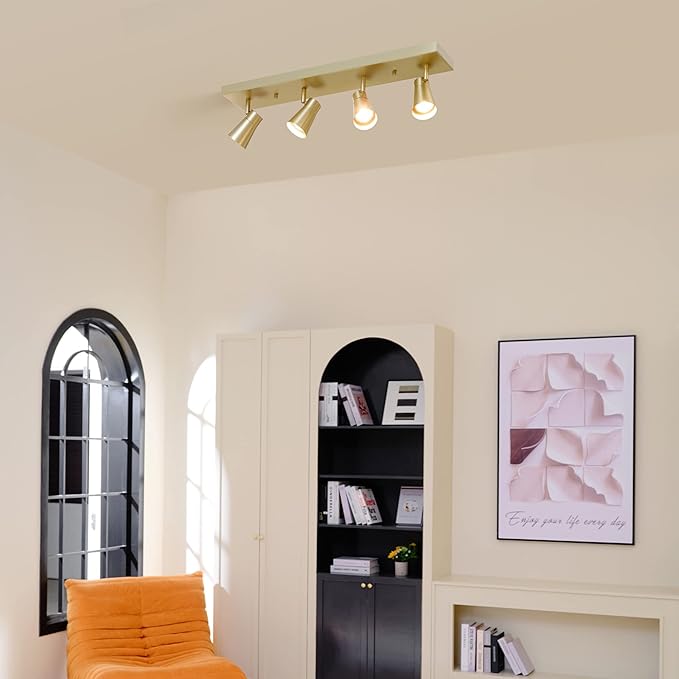 - COZY GLAM DESIGN: with conical pivoting track heads and a matte brass finish, the 4-Light Track Light highlights a perfect cozy glam design trend suitable for any room in your well-decorated home
