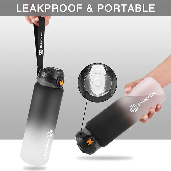 - [ SAFE NON-TOXIC TRITAN & DURABLE ] The PHIXTON 32 oz Water Bottle is made of high-quality food-grade environmentally friendly reusable Tritan co-polyester plastic, 100% BPA free and Toxin free, there is no harmful chemicals, plastic taste or bad smell, ensuring healthy drinking. It is also resistant to fall and not easily broken as it is much thick than ordinary. Suitable for both warm and cold beverages (-50 to 205°F)