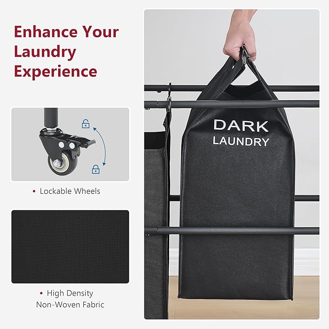 - 【Large Capacity】The laundry cart with hanging rack comes with 4 sections of laundry bags to sort your laundry by color or type. Each laundry basket can hold 13 gallons of laundry and comes with an additional 4 side pockets to improve usage efficiency.