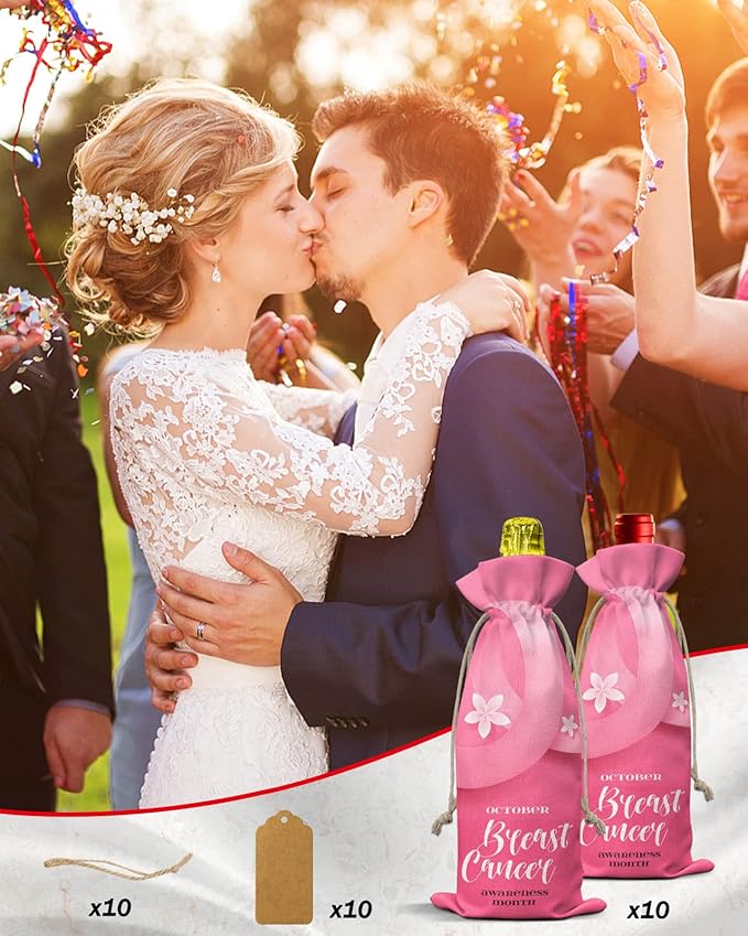 10 Pack Wine Bottle Bags, Breast Cancer Wine Bottle Cover with Drawstring, Gift Bag for Champagne, Wedding, Birthday, Christmas, Thanksgiving, Party Pink Ties Blooming Spring Floral