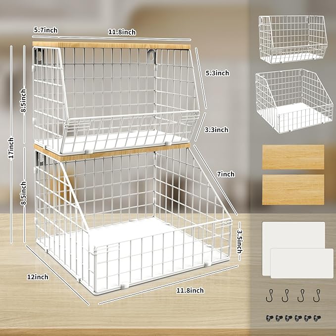 - Comprehensive Kitchen Countertop Organizer: Mefirt 2pcs white basket with a wood lid, perfect for a variety of uses. From a fruit basket to pantry storage and snack shelf, it's ideal for kitchen storage and pantry organization. The large size of the wall-mounted fruit basket is 11.8 inch x 12 inch x 8.5inch, the small size of the white fruit holder is 11.8 inch x 7.9 inch x 8.5 inch