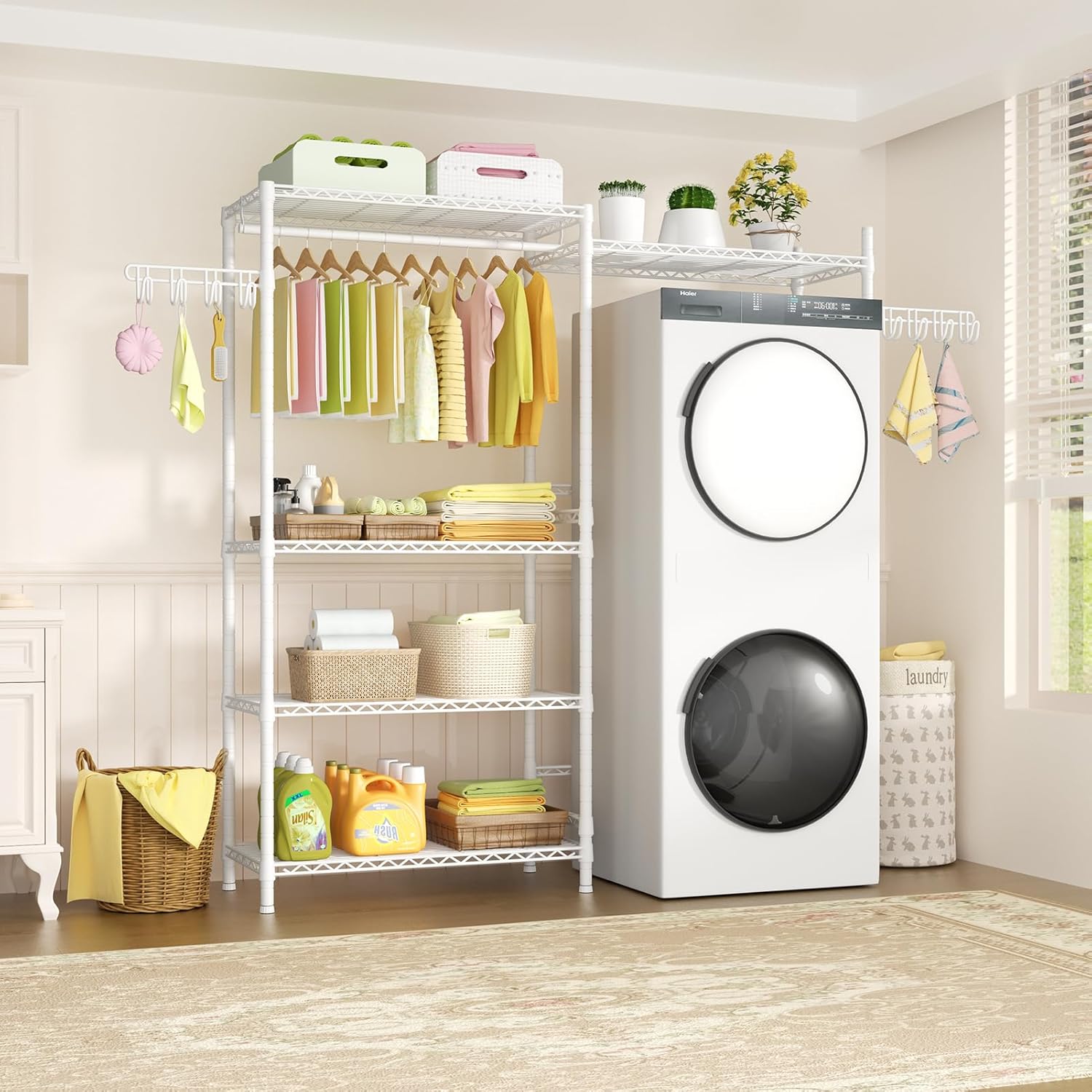 - [Customizable Assembly]: Adjust the shelves installation position to fit your washing machine type. You can custom to use the shelf quantity and the hanger rod installation position