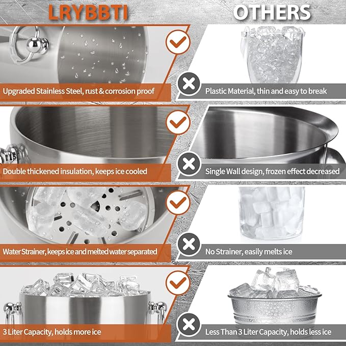 - KEEPS FROZEN LONGER - LRYBBTI 3.0 Qt ice bucket is made of double wall stainless steel for quality insulation. It is more efficient to keep your ice frozen. Comes with an airtight lid for frozen temperature locked up to 6 hours.