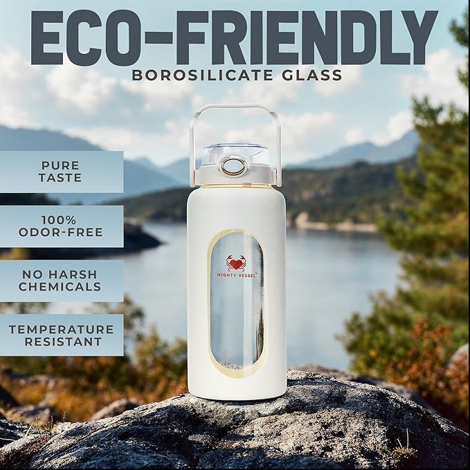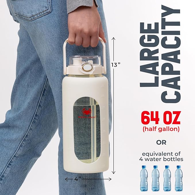 - {Unique Design} - While others are offering casual designs, our glass water bottle with silicone sleeve is made up of high quality glass.Big Water Bottle transparent nature allows you to easily monitor your water intake, ensuring you stay on track with your hydration goals.