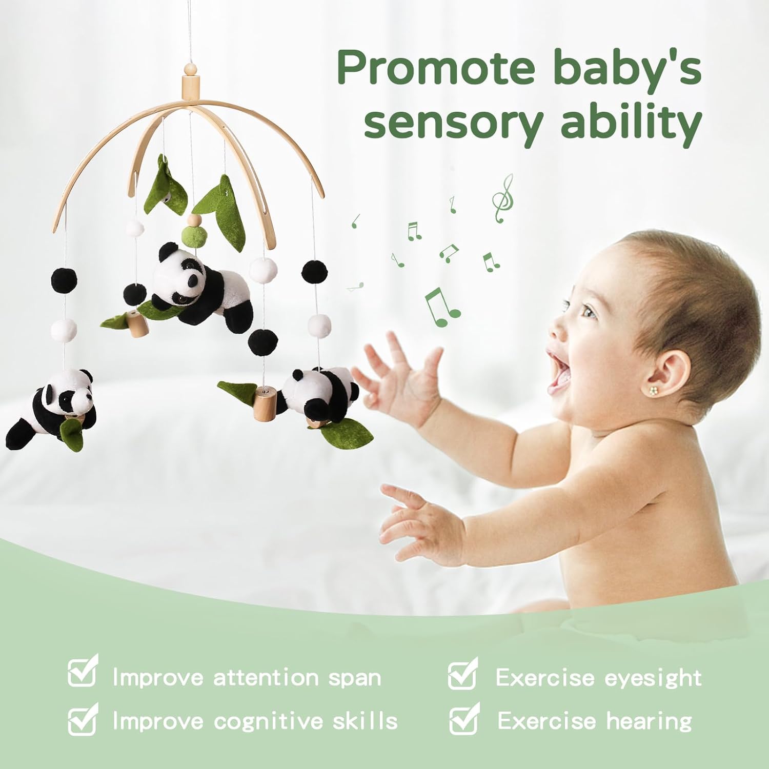 - Soothing Baby to Sleep: The baby mobile for the crib is composed of Panda, Bamboo Leaf decorations, and cute animal shapes to attract the baby's attention, which can soothe the baby. Our baby crib mobile contains bells that will make a pleasant sound when it trembles slightly or when the wind blows. It helps the baby calm down slowly and fall asleep slowly