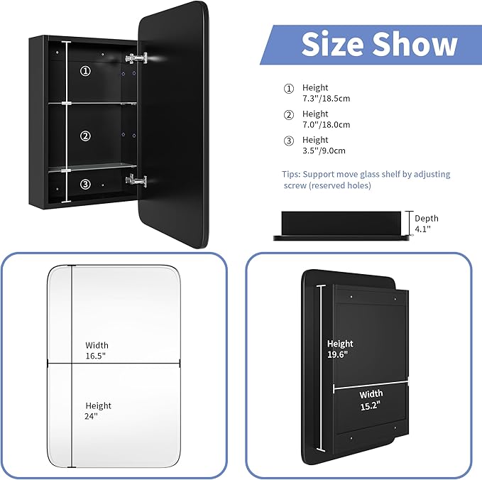 - Already Assemble: The bathroom medicine cabinet does not need to be assembled, only the adjustable shelves need to be placed manually. We also provide parts and instructions for wall mounting.