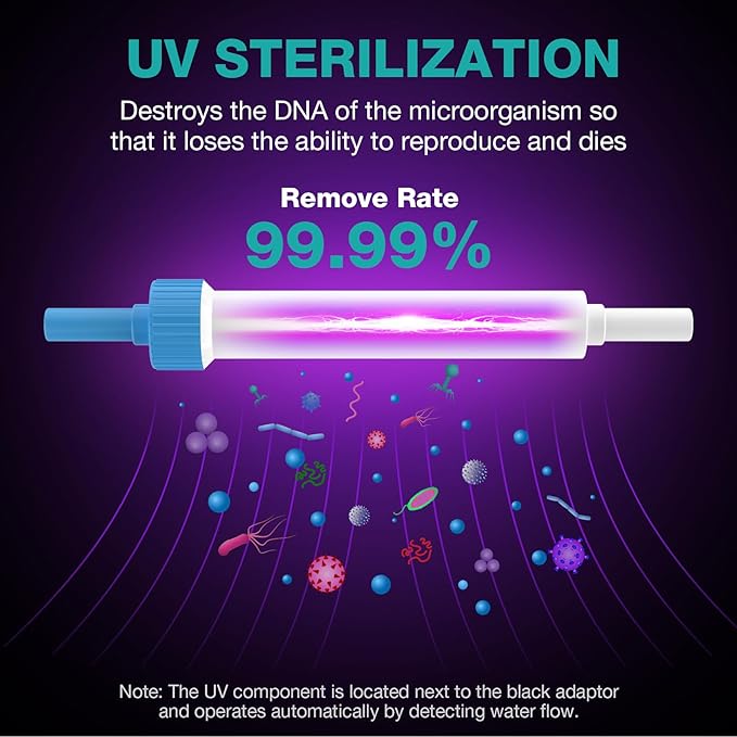 - UV STERILIZER & TANKLESS DESIGN: Our UV sterilization water purifier system eliminates algae, and other microorganisms from your tap water with an impressive removal rate of over 99.99%. It operates automatically based on water flow pressure and can be easily adjusted. The tankless design ensures fresh and clean water, while also saving valuable under-sink space and preventing secondary contamination