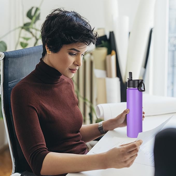 Volhoply 24 Ounce Insulated Water Bottle With Straw Lid,Stainless Steel Wide Mouth Sport Bottles With Handle,Double Wall Vacuum Thermos keep Cold,Reusable Travel Thermal Cups For Holder,Gym(Purple,1)