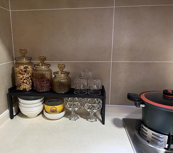 Expandable Cabinet Shelf Organizer 16-26" L Stackable Kitchen Counter Shelf Rack Stand Sink Riser Countertop Storage Black (Narrow 5.1”D)