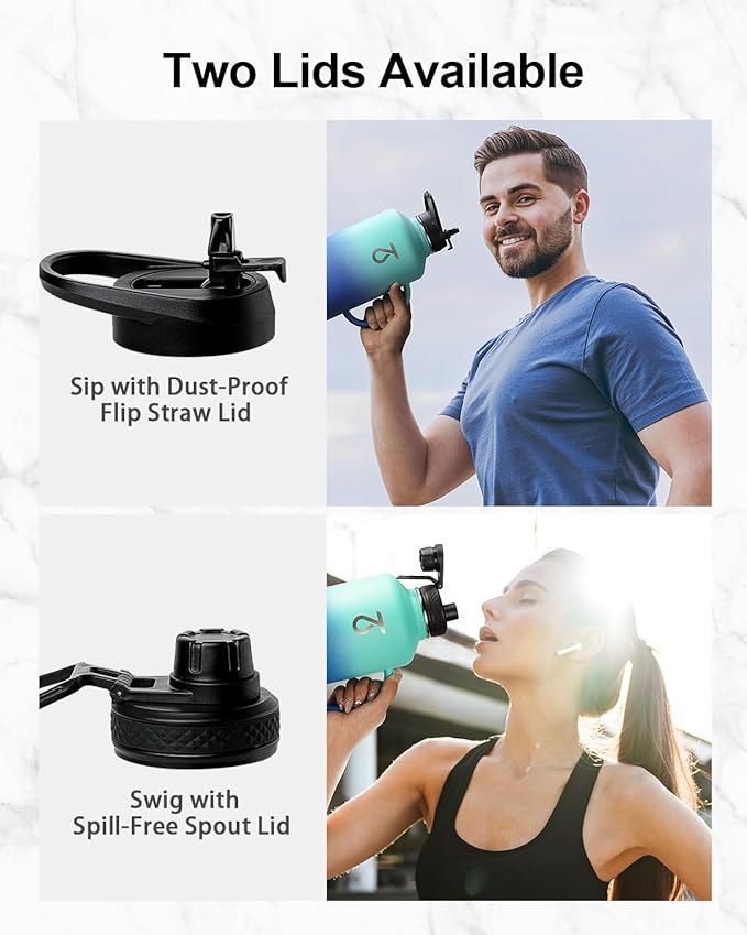 - No Spills, No Worries: Our stainless steel water bottle comes with a dust-proof flip straw lid and a spill-free spout lid, meeting your different needs. With accurate silicone seal rings, they are both 100% leak-proof and spill-proof.