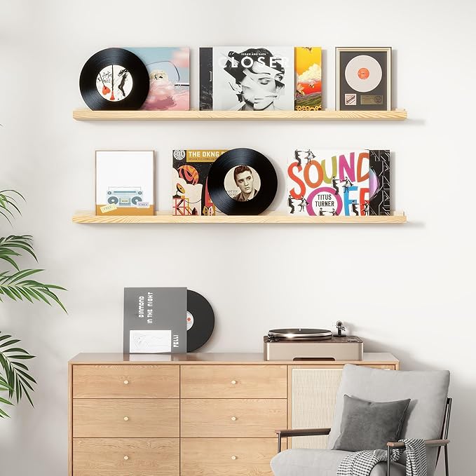 - Picture Ledge Shelves: The ledge in front of the wall shelves could prevent your precious items from falling off. And we handcraft a shallow groove on each book shelf to protect your items from sliding forward. Each floating shelf is 5 inches in depth with a 1.25 inches lip, you can put photos, pictures, DVD players, videos, books, toys, and some other knickknack on this beautiful display wooden shelf