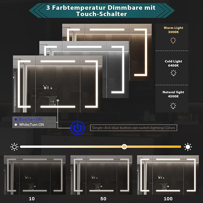 - 【Medicine Cabinet With Led Lights】DICTAC bathroom medicine mirror cabinet with 3-color temperatures LED lights (warm/cold/natural) provide 3 lighting modes from 3000K to 6500K. Just touch the blue switch on the mirror to turn on the LED lights. Single click blue button can switch between these three colors of lights, and a long press to adjust the light brightness. Next time lit up,the Memory founction will retain the last setting that you've used.