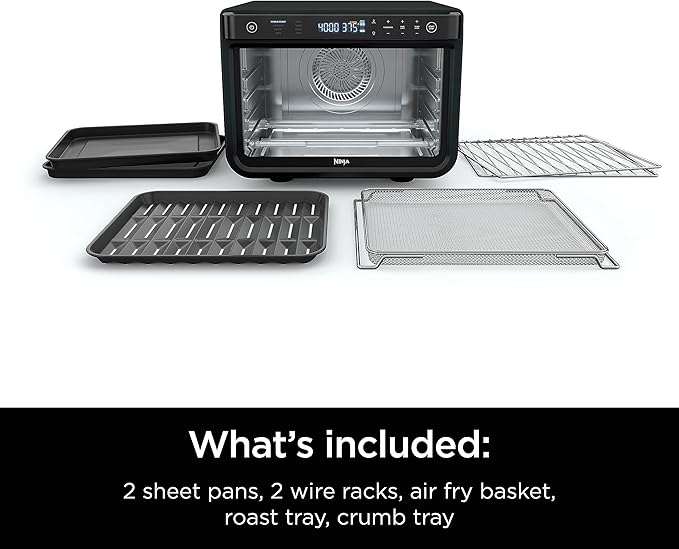 - WHAT’S INCLUDED: 2 sheet pans, 2 wire racks, air fry basket, roast tray, & crumb tray.
