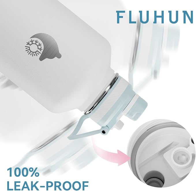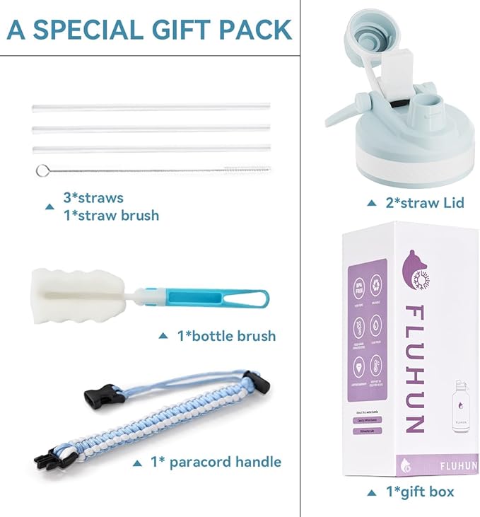 - WHAT YOU'LL GET: We offer lifetime warranty and 100% customer satisfaction against any defect or leakage. Package contains: FLUHUN 64 oz water bottle insulated, 2 replaceable 2-in-1 (straw & spout) lids with straws , straw brush, paracord handle, bottle brush and gift box.