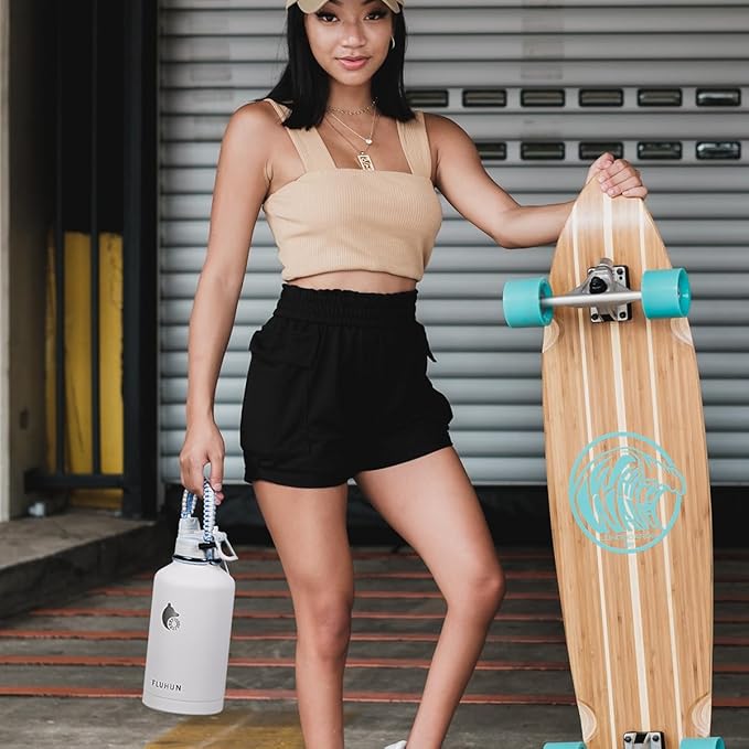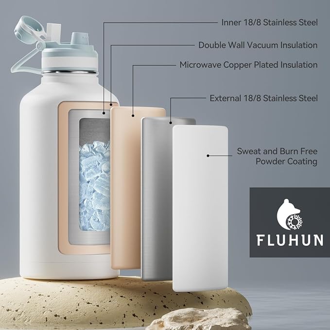 - DOUBLE WALL INSULATION: FLUHUN 64 oz Half Gallon Insulated Water Bottle features copper plated double wall vacuum insulation to keep your drinks icy cold for up to 48 hrs and reassure warm 24 hrs. Take your fitness routine to the next level with this iconic water jug that you'll love to keep every sip of water cool and refreshing.