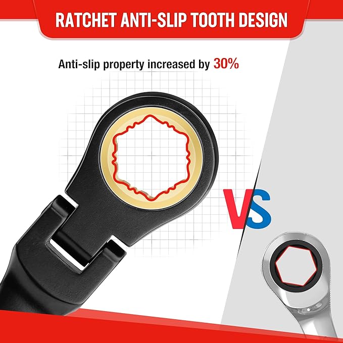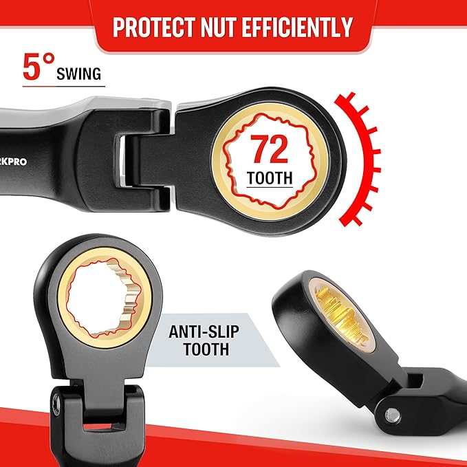 - Efficient Wrench: The 72-tooth ratchet on the box end is smooth and requires only a 5-degree working swing arc, allowing it to rotate in limited spaces and achieve simple and fast operation. The 180-degree flexible head helps you reach narrow spaces that most ratchet wrenches cannot, making the operation easy