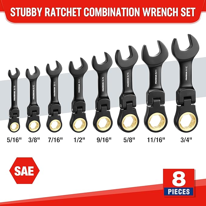 WORKPRO 8-Piece Stubby Anti-slip Ratcheting Combination Wrench Set, SAE 5/16-3/4 in, 72-Teeth, CRV, Black Electrophoretic Coating, Flex-Head Wrench Set with Rolling Pouch