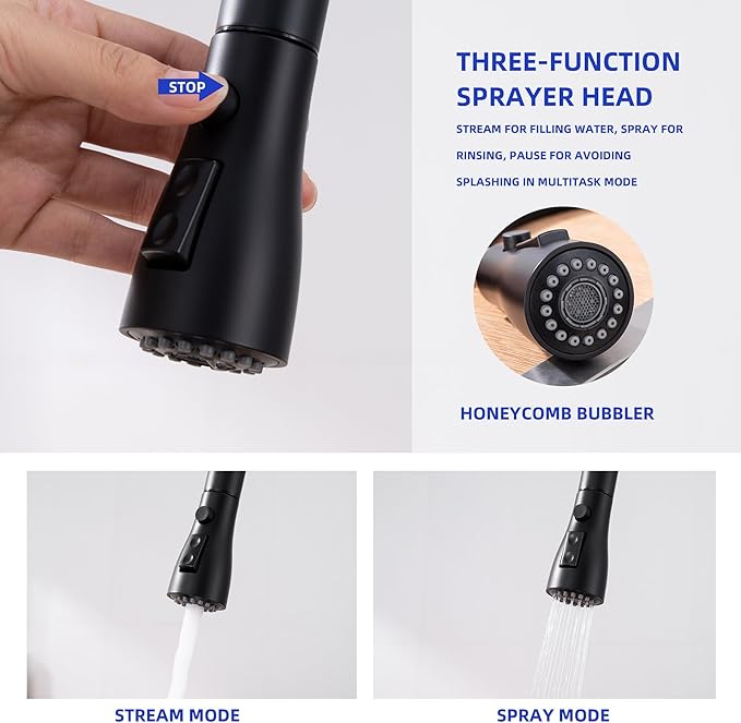 - Multi-Functional Pull-Down Sprayer: Our faucet's multi-functional pull-down spray head is a game-changer. Effortlessly switch between two modes - the gentle inflatable water flow for delicate washing and the powerful jet for efficient rinsing. The 17-inch pull-out hose offers a wide range of motion, making cleaning a breeze.