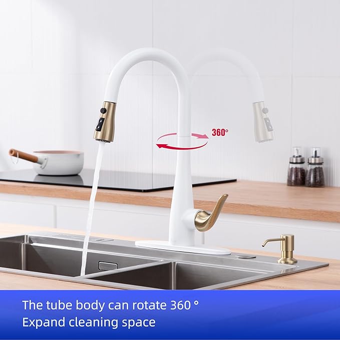 - Chic Matte White and Gold Color: Embrace with our HGHGK faucet in a mesmerizing matte white color,that elevate your kitchen. Included soap dispenser enhances functionality and tidiness, making culinary tasks effortless and organized.