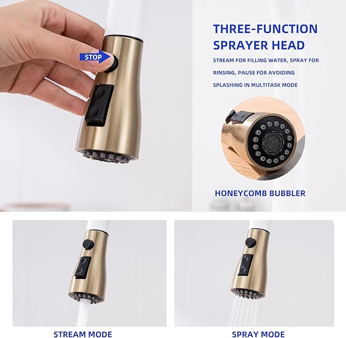 - Multi-Functional Pull-Down Sprayer: Our faucet's multi-functional pull-down spray head is a game-changer. Effortlessly switch between two modes - the gentle inflatable water flow for delicate washing and the powerful jet for efficient rinsing. The 17-inch pull-out hose offers a wide range of motion, making cleaning a breeze.
