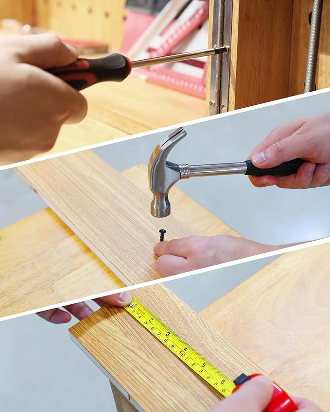 - [Complete Varieties] - 8 pieces hex key set, precision screwdrivers, hammer, tape measure, pliers etc. The bit holders, 9mm utility cutter, scissor and 106 pieces fasteners. Variety of 1/4-inch screwdriver bits: Phillips, slotted, square, star and pozi. Soft-grip handle on screwdrivers, pliers and hammer provides excellent comfort and control.