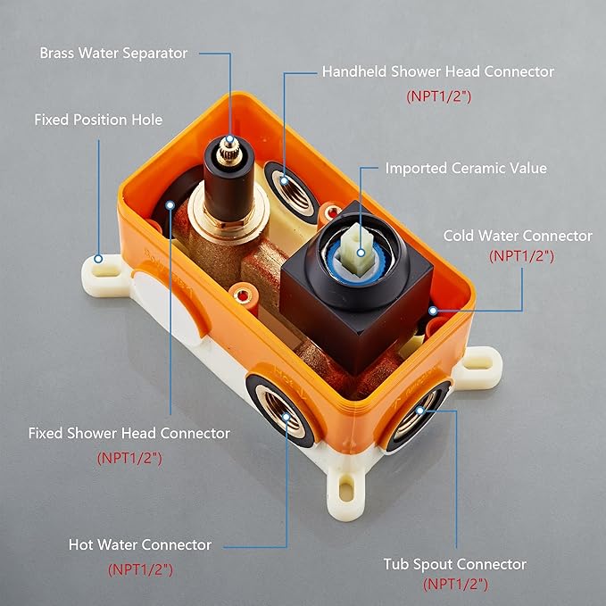 - 【Easy Installtion】: Shower valve and trim kit with NPT 1/2" connecting thread,designed to easily install with standard U.S. plumbing connections for saving man-hour cost during installing. We are equipped with two adjustable brackets for handheld shower heads, which are convenient for both adults and children to use together.