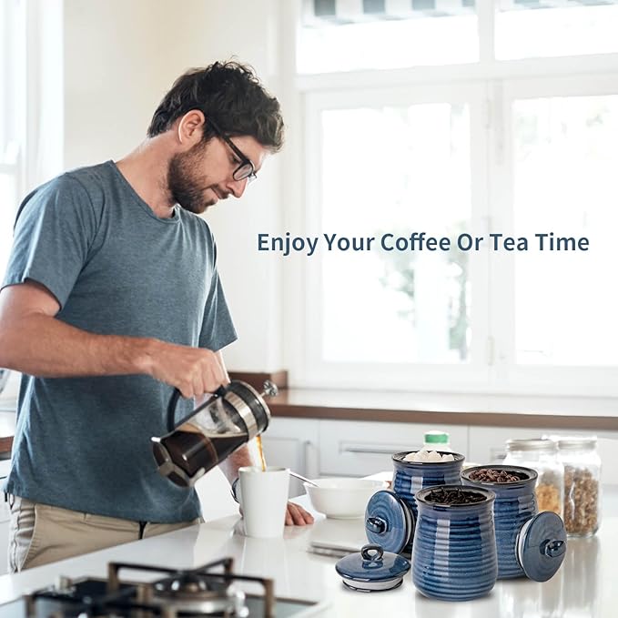 - EXIQUITE AND VINTAGE DECOR: Our canisters are feature a reactive glaze which can add a farmhouse-style attraction to your home. The blue color with horizontal stripes match the kitchen and adds a touch of sophisticated handmade rusticity to the countertop.